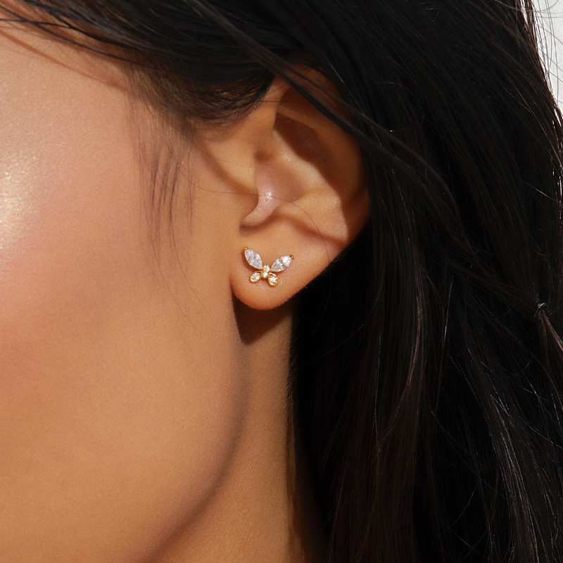 Hoa tai bạc 925 hình bướm được chế tác từ bạc Ý cao cấp, phủ vàng hoặc vàng hồng 18K sáng bóng. Mỗi đôi được đính 6 viên đá trắng nhỏ lấp lánh, tạo hiệu ứng phản chiếu ánh sáng tinh tế. Thiết kế nhỏ gọn, dễ đeo và thoải mái suốt ngày dài. Biểu tượng của sự tự do, biến đổi và vẻ đẹp nữ tính, đôi hoa tai này giúp tôn lên nét rạng rỡ và duyên dáng của người đeo. Phù hợp với phụ nữ yêu phong cách nhẹ nhàng, tinh tế. Dễ phối với trang phục hàng ngày, đi chơi, hẹn hò hay dự tiệc, mang đến vẻ lấp lánh vừa đủ mà vẫn sang.