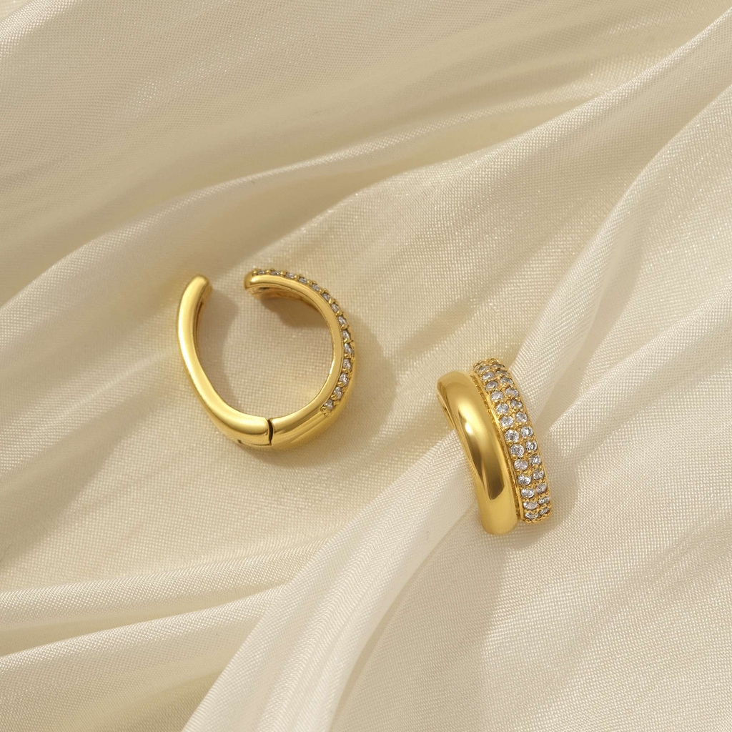 Khuyên tai earcuff chế tác từ bạc 925 mạ vàng, tạo điểm nhấn với dáng uốn lượn mềm mại và dải đá lấp lánh ôm theo viền. Thiết kế tượng trưng cho sự uyển chuyển và nét đẹp tự tin, phù hợp cho cô gái yêu sự tinh tế nhưng vẫn muốn nổi bật. Dễ phối cùng tóc buông, váy dự tiệc hay outfit tối giản, giúp đôi tai sáng bừng chỉ với một lần bấm nhẹ nắp bật cao cấp.