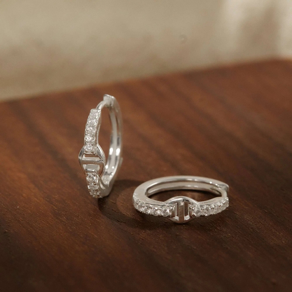Từ những viên đá li ti đính đều trên hoop Bạc 925, ánh sáng tụ lại ở chi tiết khóa cách điệu, tạo nên một điểm nhấn mềm mại nhưng vẫn rất có chiều sâu. Chính sự tinh xảo trong từng phần nhỏ khiến tổng thể khuyên trở nên hài hòa và hiện đại. Nhờ đó, mẫu hoop này hợp với nàng yêu phong cách tối giản thanh lịch, dễ phối cùng các khuyên mảnh khác để stacking và đeo đẹp từ ngày thường đến những buổi hẹn nhẹ nhàng.