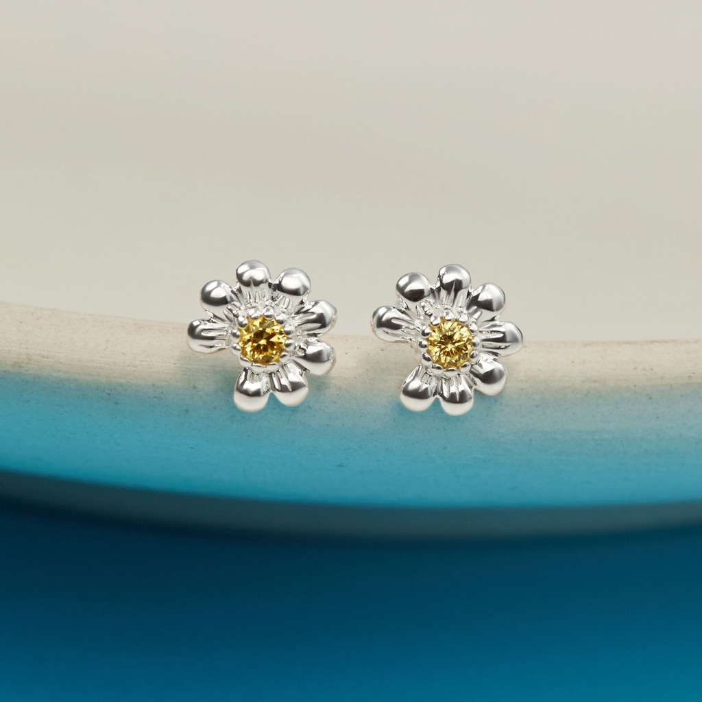 Thiết kế 3D tinh xảo trên nền bạc 925 sáng bóng, điểm xuyết đá Cubic Zirconia hình nụ hoa cúc nhỏ xinh, cánh mượt mà, nhụy vàng đính đá lấp lánh. Kiểu dáng thanh thoát, đối xứng, tạo vẻ ngây thơ, duyên dáng. |