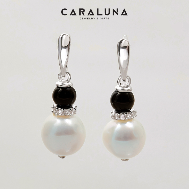 Khuyên Tai Bạc 925 Dáng Treo Ngọc Trai Tự Nhiên Kết Hợp Đá Onyx Đen Và CZ Trắng
