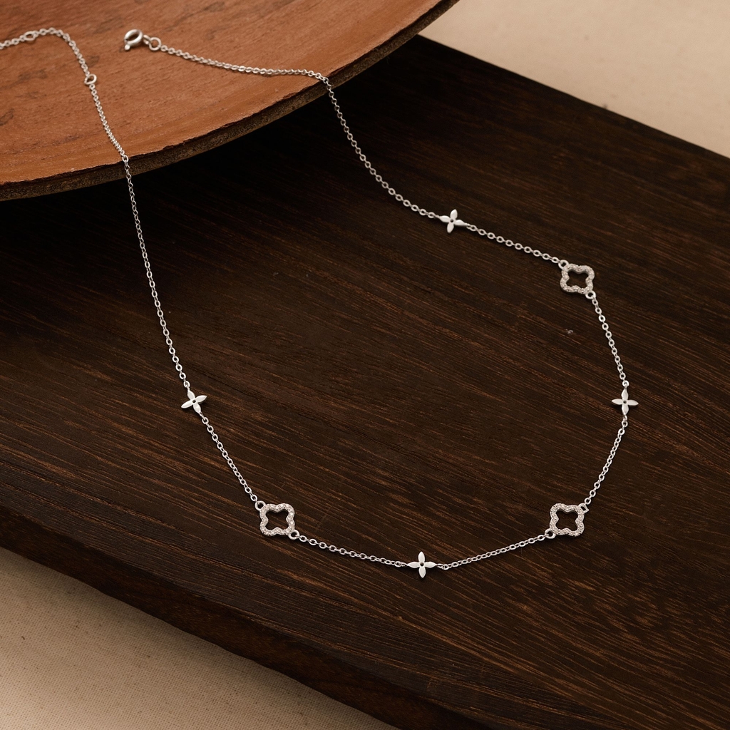 Dây chuyền bạc 925 Lucky Clover nhiều charm nổi bật với cỏ 4 lá xen kẽ hoa cưa lấp lánh, tượng trưng cho may mắn và niềm vui. Thiết kế trẻ trung, tạo hiệu ứng chuyển động tinh tế khi đeo. Phù hợp với phụ nữ yêu sự lãng mạn, lý tưởng làm quà tặng dịp Valentine, sinh nhật hoặc hẹn hò.