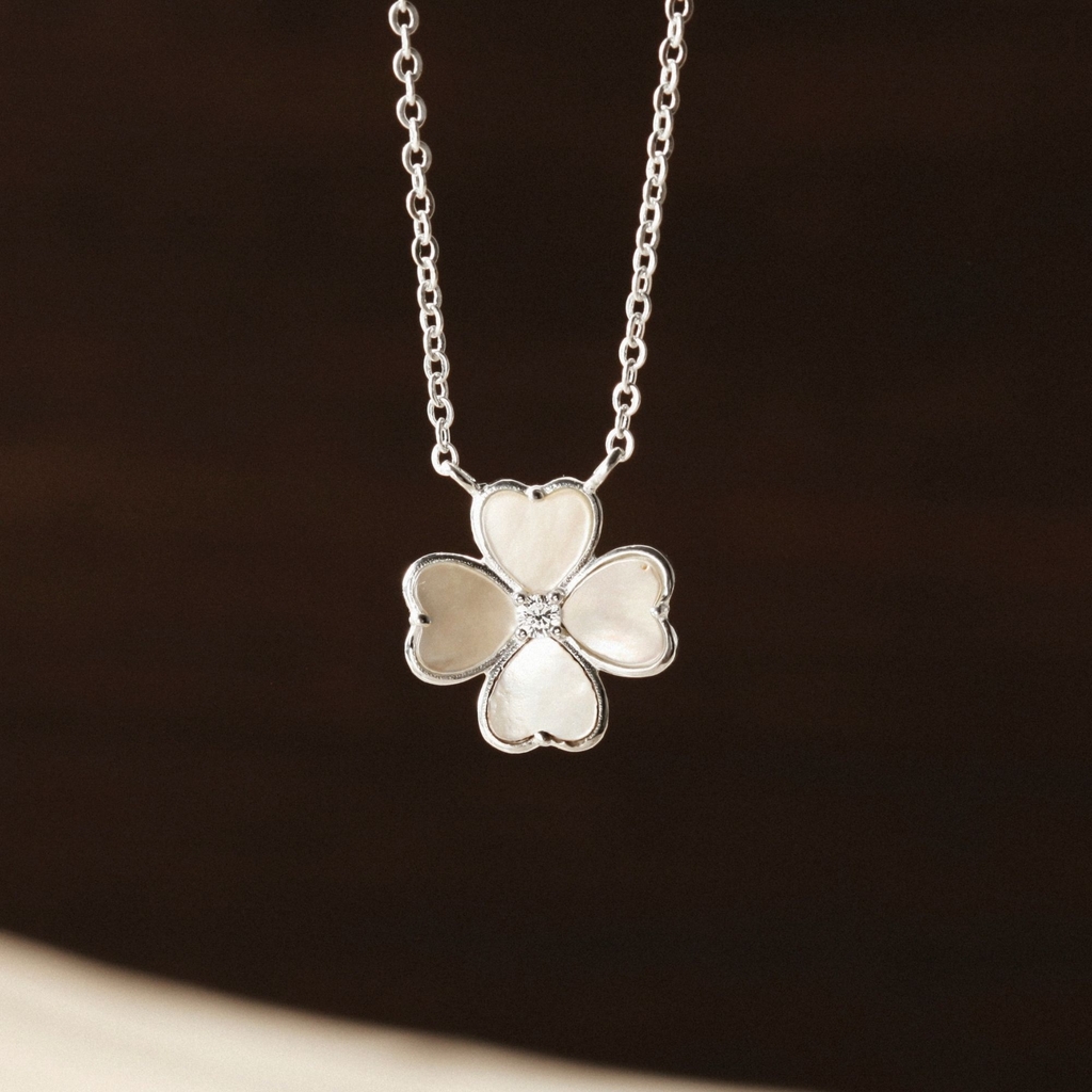 Thiết kế mặt dây hình cỏ bốn lá cách điệu, từng cánh uốn cong như trái tim khảm trai xà cừ trắng ngà óng ánh tự nhiên, biểu tượng cho may mắn và yêu thương trọn vẹn. Dây xích mảnh dài 40–45cm dễ điều chỉnh, tôn lên vẻ thanh lịch, nữ tính. |