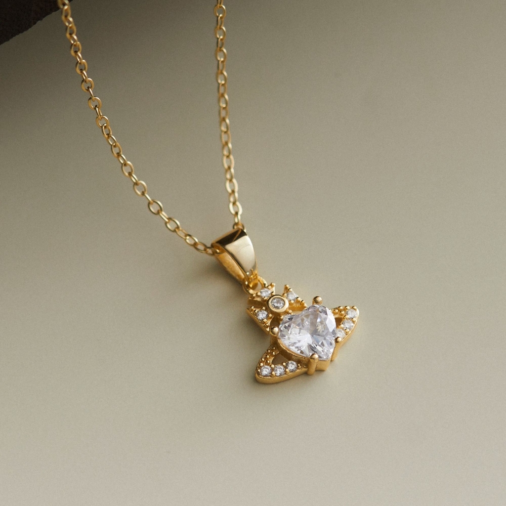 Vòng Cổ Bạc 925 Hình Hành Tinh Sao Thổ - VCN508 chế tác từ bạc Ý 925 mạ vàng 18K, thủ công tinh xảo. Charm Sao Thổ lấp lánh với vòng đai đính đá cubic zirconia và viên đá trung tâm pear cut, tạo hiệu ứng vũ trụ huyền bí. Biểu tượng cho sự ổn định, trách nhiệm và tình yêu vĩnh cửu, lý tưởng làm quà tặng. Phù hợp phụ nữ trẻ trung, hiện đại, dùng hàng ngày, hẹn hò hay dự sự kiện. Phong cách cá tính, sang trọng, dễ phối cùng trang phục basic để tăng điểm nhấn lấp lánh.