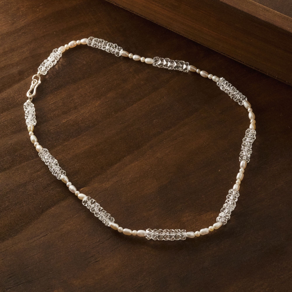 Thiết kế chuỗi bạc 925 mảnh mai, xen kẽ ngọc trai tự nhiên óng ả và đá thạch anh trắng lấp lánh. Kiểu dáng thanh thoát, hạt đá lớn nhỏ sắp xếp đều, tạo vẻ tinh tế, hài hòa. Phong cách nhẹ nhàng, phù hợp sự thanh lịch, nữ tính. |