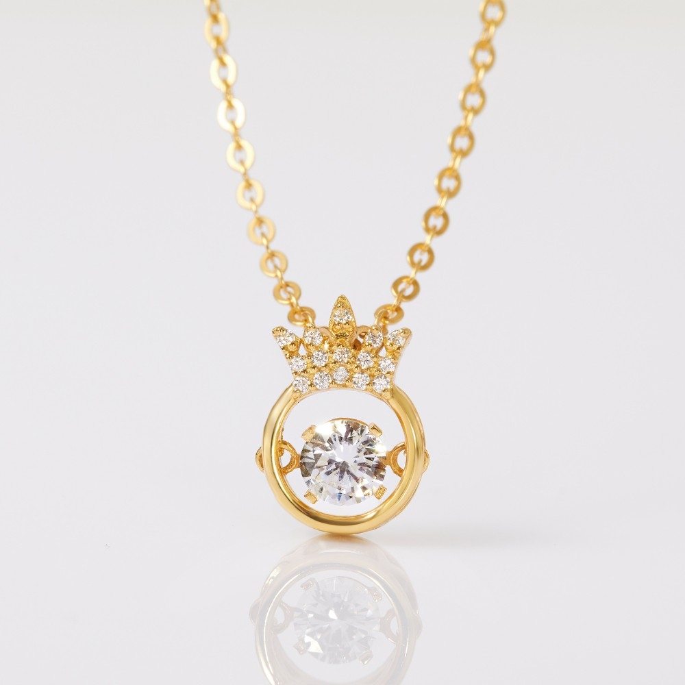 Dây chuyền được chế tác từ vàng 10K cao cấp, mang thiết kế vương miện tròn đầy tinh tế, gợi cảm hứng từ vẻ đẹp hoàng gia. Ở trung tâm là viên đá nhảy Moissanite rực rỡ, bao quanh bởi những viên đá nhỏ lấp lánh tạo hiệu ứng sáng huyền ảo. |