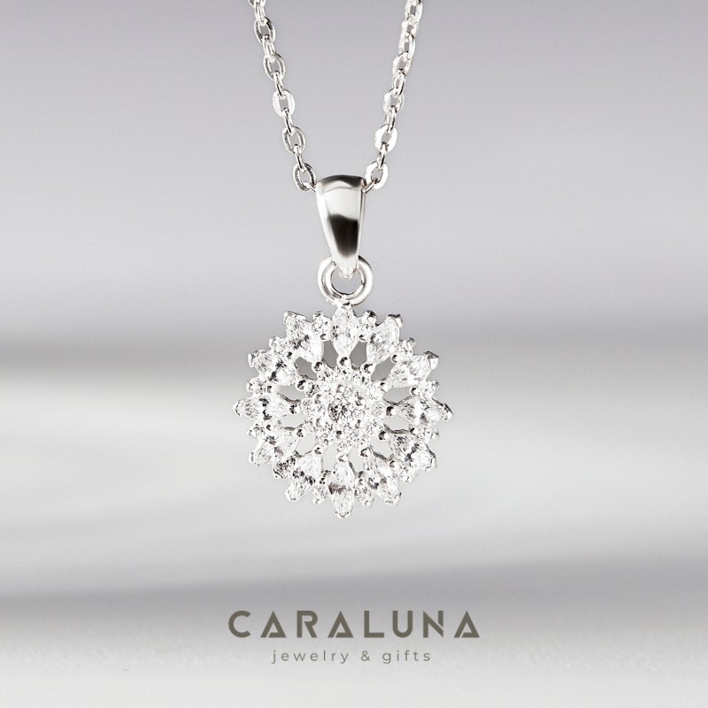 - Kiểu dáng: Dây chuyền gắn mặt charm - pendant necklace; mặt dây chuyền hình tròn đính 37 viên đá CZ trắng kích cỡ lớn nhỏ tạo thành hình hoa;...