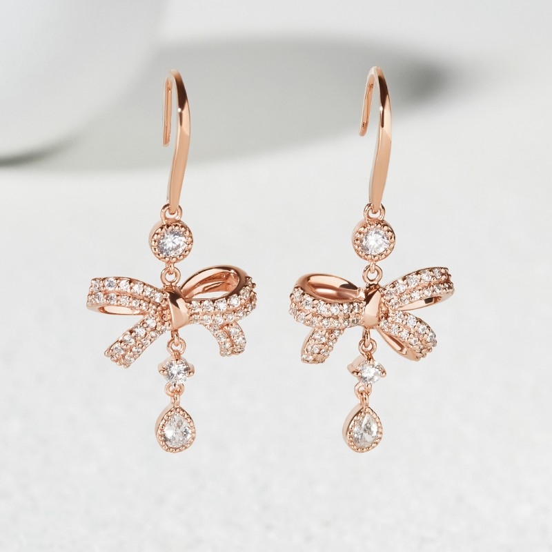 Khuyên tai thả hình nơ treo đá tròn và đá giọt nước CZ trắng |