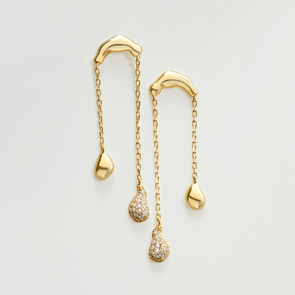 Khuyên tai được chế tác từ bạc 925 tinh tế, kết hợp vàng mạ 18K sang trọng, mang phong cách bất đối xứng độc đáo. Phần trên uốn cong mềm mại như giọt nước, treo hai hàng dây dài khác nhau. Hàng trên điểm xuyết một viên đá lấp lánh hình giọt nước, trong khi hàng dưới kết hợp một viên đá rực rỡ và một giọt vàng bóng bẩy, tạo cảm giác nhẹ nhàng, uyển chuyển khi đeo. |