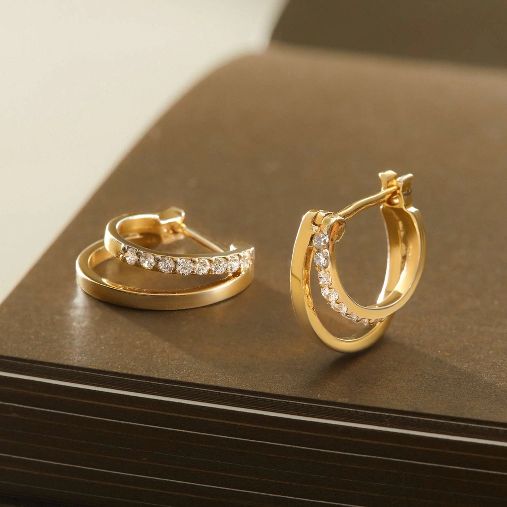 Khuyên tai bạc 925 thiết kế hai vòng đan xen, một vòng trơn mềm mại ôm sát tai, một vòng đính đá lấp lánh tạo điểm sáng tinh tế. Biểu tượng của sự cân bằng và nét đẹp hiện đại, phù hợp cho nàng yêu phong cách thanh lịch. Đeo trong tiệc, đi làm hay dạo phố đều sang xinh. Dễ phối cùng váy tối màu, áo đơn sắc hoặc layer với các mẫu vòng tai mảnh để tăng hiệu ứng nổi bật.