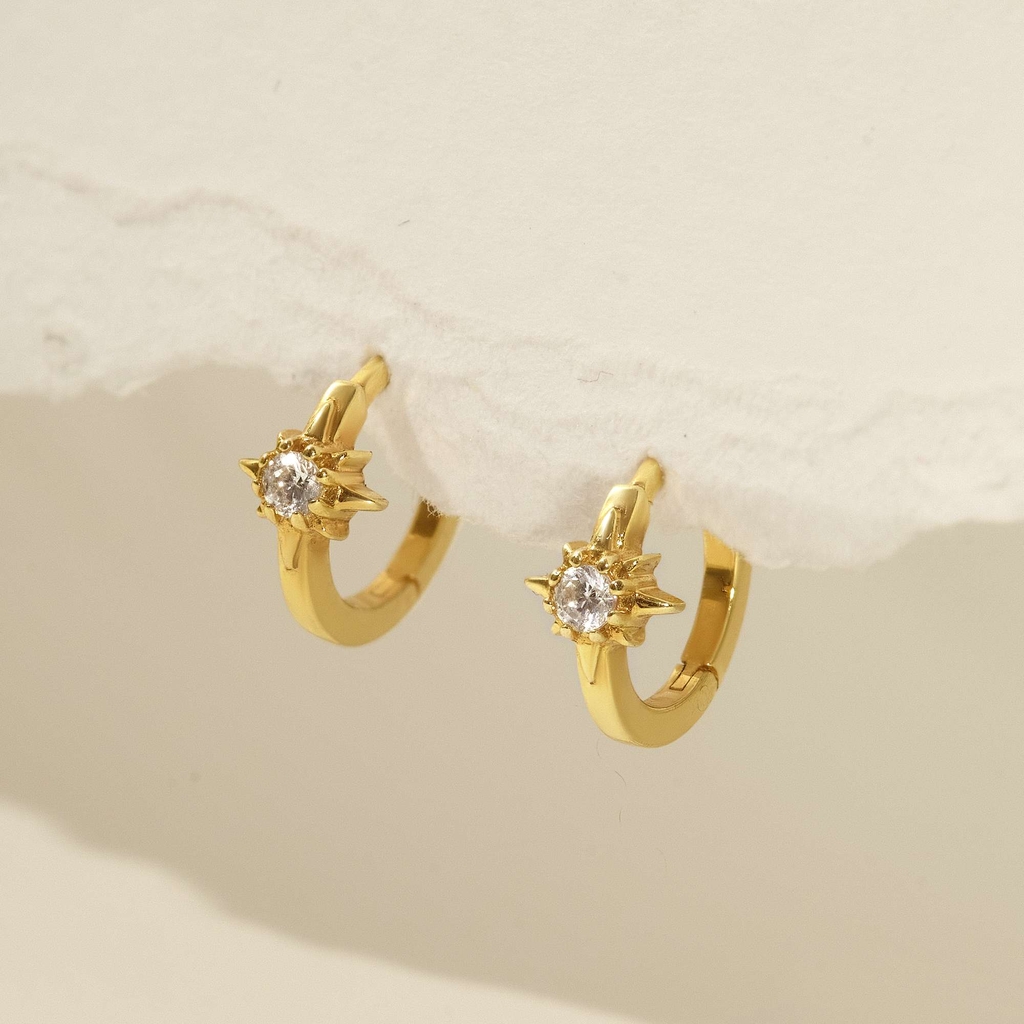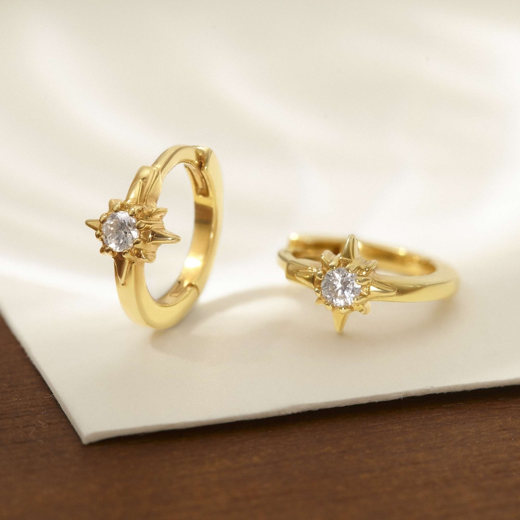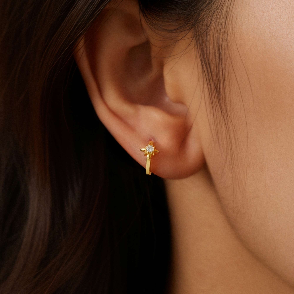 Khuyên tai hoop Bạc 925 mạ vàng nổi bật với biểu tượng sao 8 cánh đính đá ở đầu vòng tạo điểm sáng nhỏ nhưng rực rỡ. Hình sao mang ý nghĩa dẫn lối và may mắn, hợp với nàng yêu vẻ nữ tính pha chút cá tính. Thiết kế nhỏ gọn dễ phối, đeo riêng đã xinh mà mix cùng hoop trơn hoặc nụ đá lại càng nổi bật. Thích hợp cho đi làm, dạo phố, hẹn hò hoặc những dịp cần điểm nhấn tinh tế mà vẫn nhẹ nhàng.