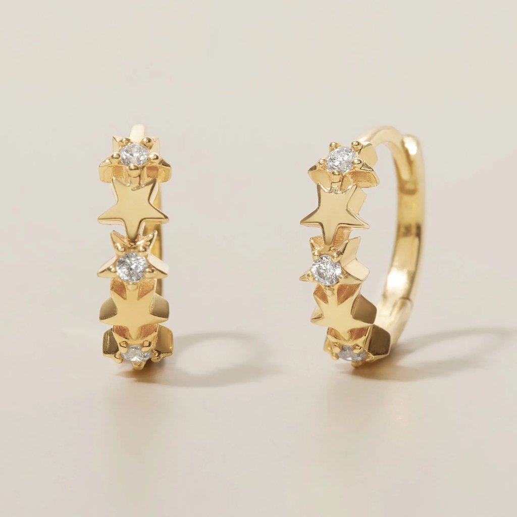 Khuyên Tai Hoop Huggies Bạc 925 Hình Ngôi Sao Nhỏ Đính Đá Star Huggies nổi bật với thiết kế hoop huggies nhỏ nhắn ôm sát dái tai, chế tác từ bạc 925 cao cấp sáng bóng. Dọc theo vòng hoop là ba ngôi sao xếp liền nhau, mỗi ngôi sao được đính đá CZ lấp lánh ở tâm, tạo hiệu ứng lung linh như bầu trời đêm. Đường nét sao sắc sảo, cân đối, mang lại vẻ thanh lịch xen chút cá tính. Thiết kế phù hợp đeo hàng ngày hoặc tiệc tối, tôn vinh phong cách hiện đại, tinh tế.