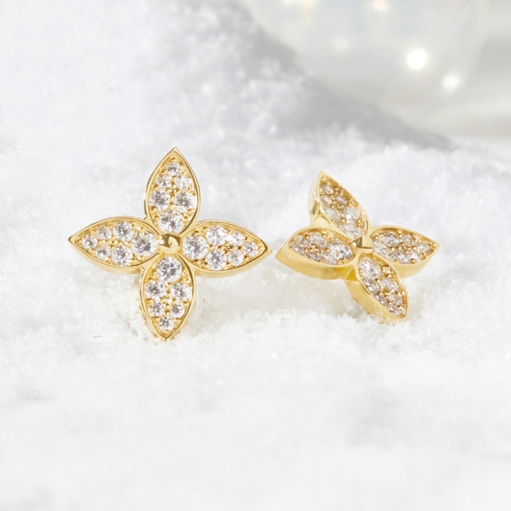 Thiết kế tinh xảo với hình hoa bốn cánh to bản đính full đá CZ lấp lánh, chấm bạc trung tâm làm nụ, cánh hoa đối xứng tạo hiệu ứng bắt sáng. |