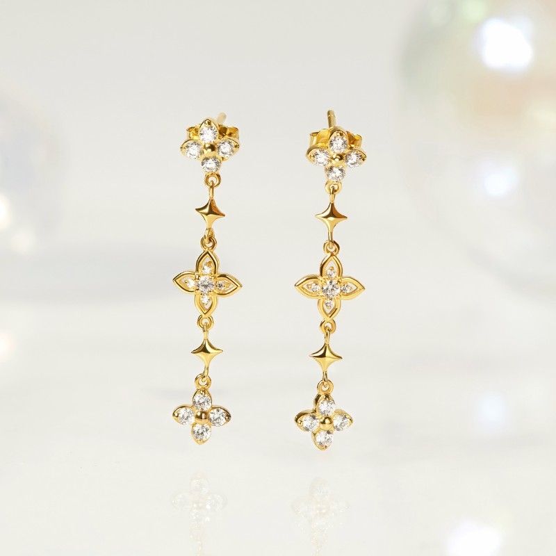 Thiết kế thả dài với dải hoa 4 cánh đính full đá CZ trắng lấp lánh, mối nối mảnh tạo chuyển động mềm mại. Kiểu dáng tinh xảo, cân đối, với các cánh hoa chạm khắc sắc sảo, mang lại vẻ sang trọng và uyển chuyển. |