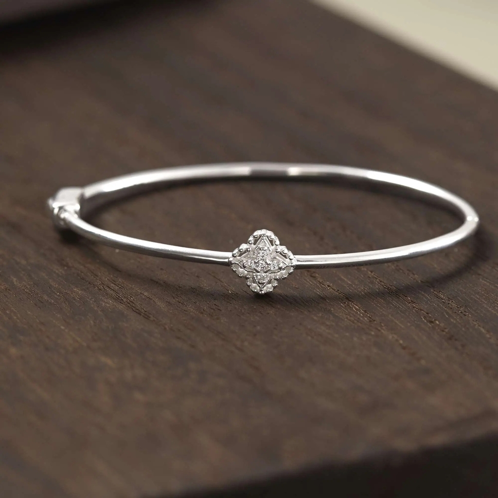 Thiết kế vòng cứng tròn từ bạc 925 sáng bóng, điểm nhấn mặt cỏ 4 lá tinh xảo đính đá lấp lánh trung tâm. Kiểu dáng thanh mảnh, cổ điển, tạo vẻ sang trọng, duyên dáng. |