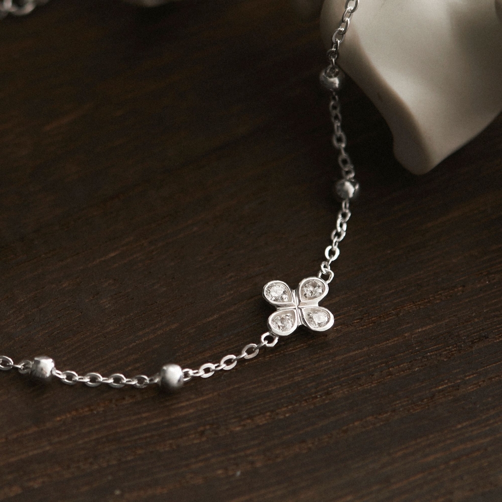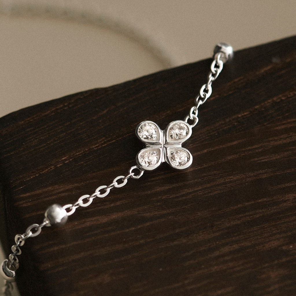 Lắc chân gắn mặt charm - charm anklet; mặt vòng hình cỏ 4 lá gắn đá CZ trắng; dây phụ 2.5 cm giúp tùy chỉnh size |