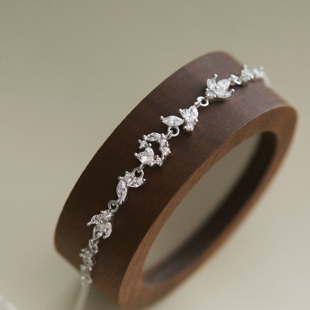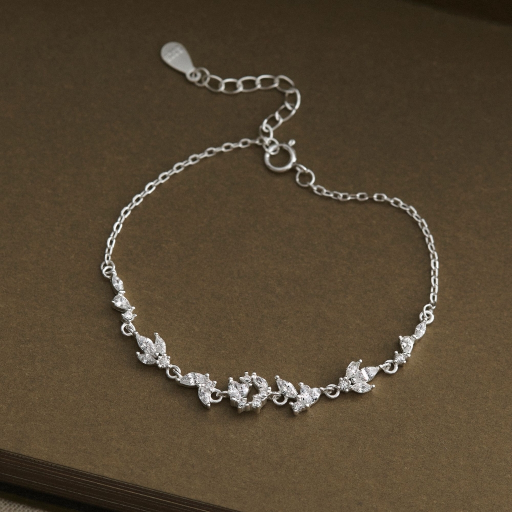 Lắc tay với dây xích mỏng dài dễ điều chỉnh vừa tay. Điểm nhấn là dải charm hoa lá uốn lượn mềm mại, từng chi tiết hoa và lá được chạm khắc tinh tế, đính đá cubic zirconia lấp lánh như giọt sương mai. Thiết kế mang vẻ nữ tính, thanh lịch, phù hợp đeo mỗi ngày hoặc mix cùng nhẫn bạc để tạo phong cách tinh xảo và cuốn hút. |