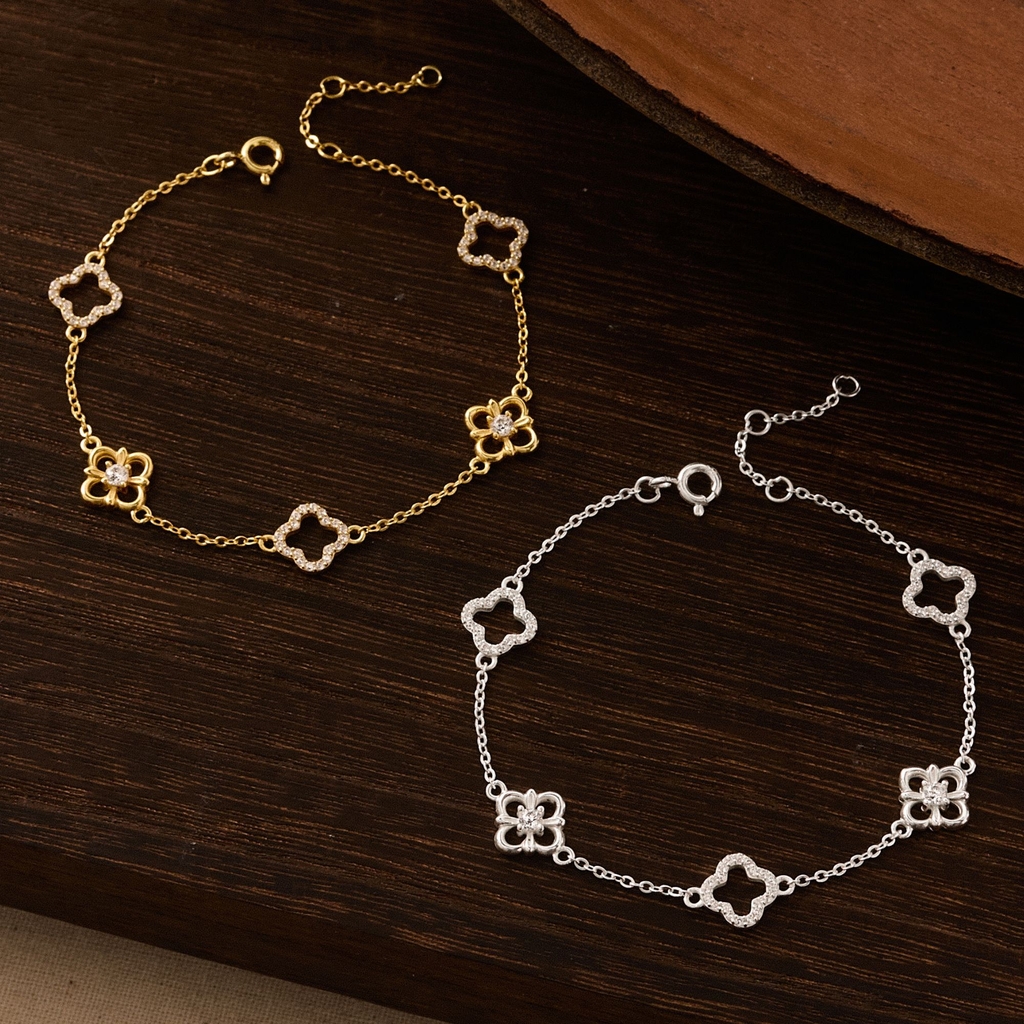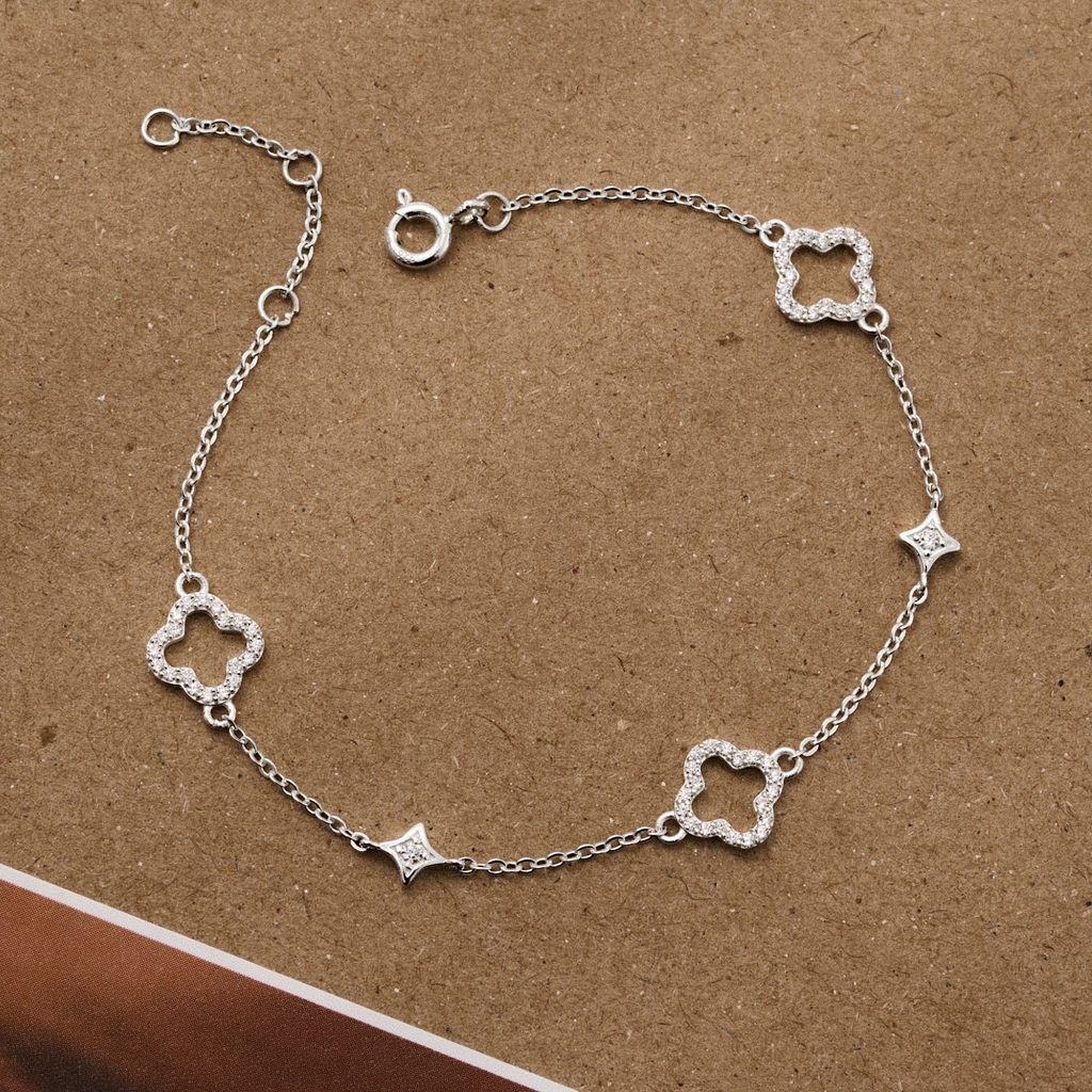 Lắc tay bạc 925 Lucky Clover nổi bật với 5 charm cỏ 4 lá đính đá lấp lánh, biểu tượng của may mắn và hạnh phúc. Thiết kế thanh mảnh, tinh tế, dễ phối nhiều phong cách. Phù hợp với phụ nữ yêu sự lãng mạn, lý tưởng làm quà tặng dịp Valentine, sinh nhật hoặc hẹn hò.