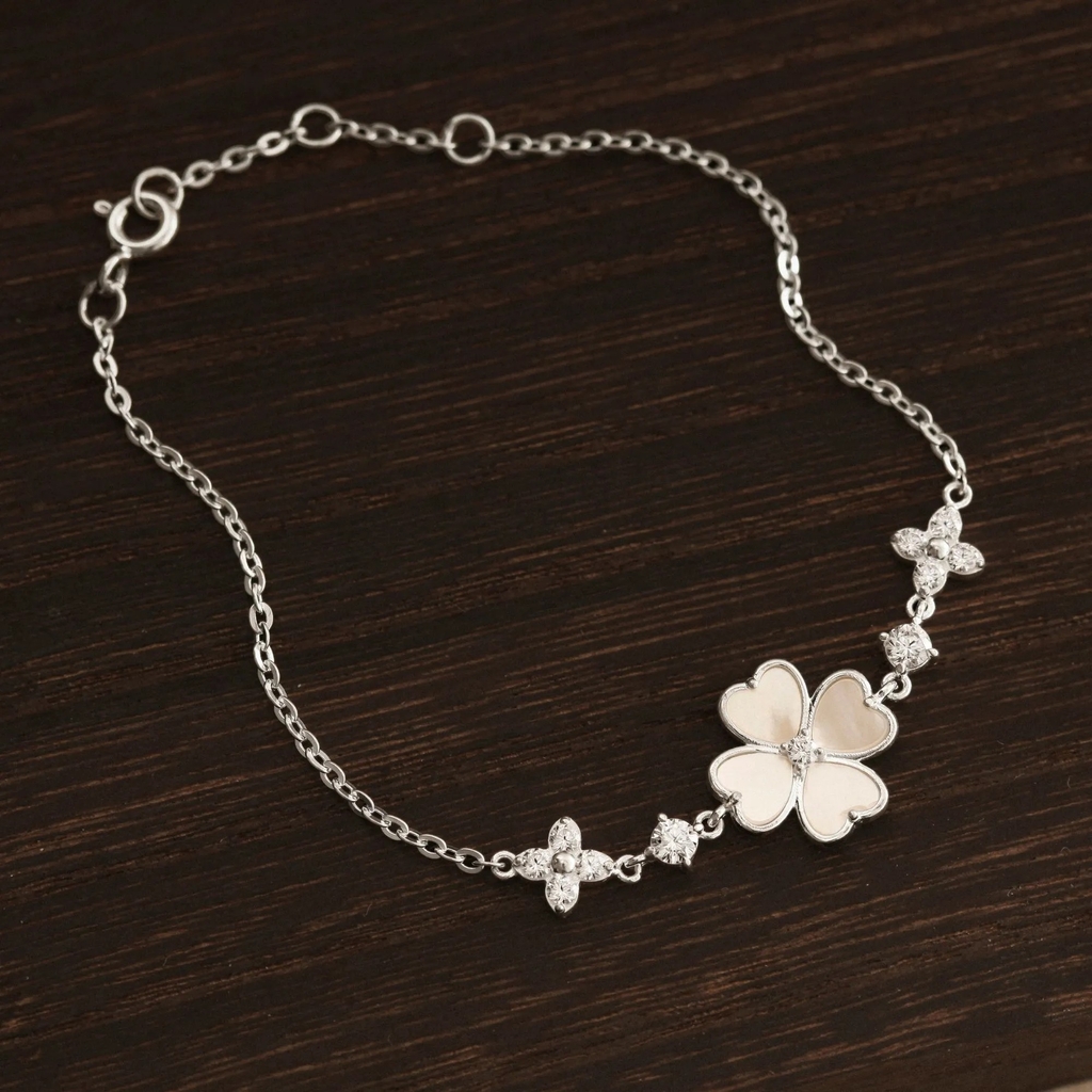 Thiết kế tinh xảo với chuỗi bạc mảnh mai được điểm xuyết hoa cỏ bốn lá cách điệu hình trái tim. Mỗi cánh hoa được phủ lớp trai xà cừ óng ánh, xen kẽ đá cz lấp lánh, tạo nên hiệu ứng sáng nhẹ nhàng và sang trọng. |