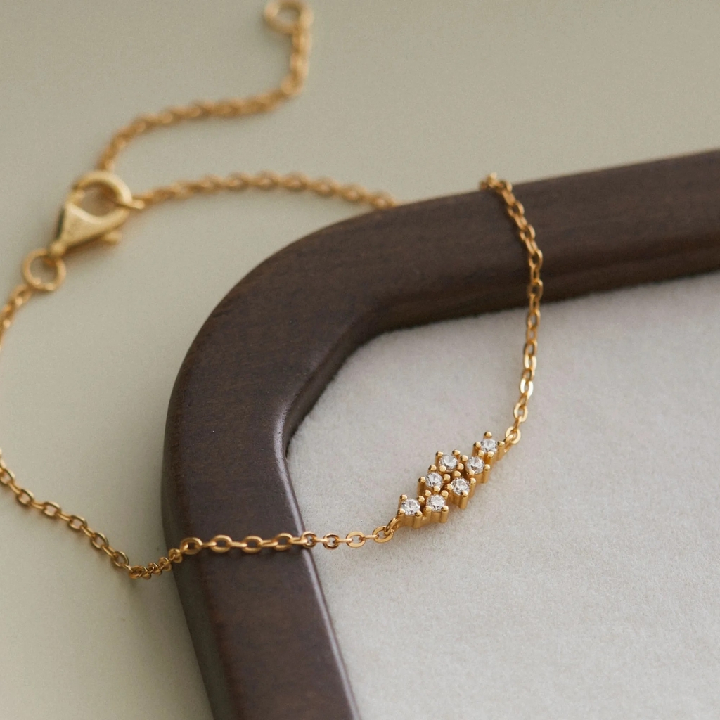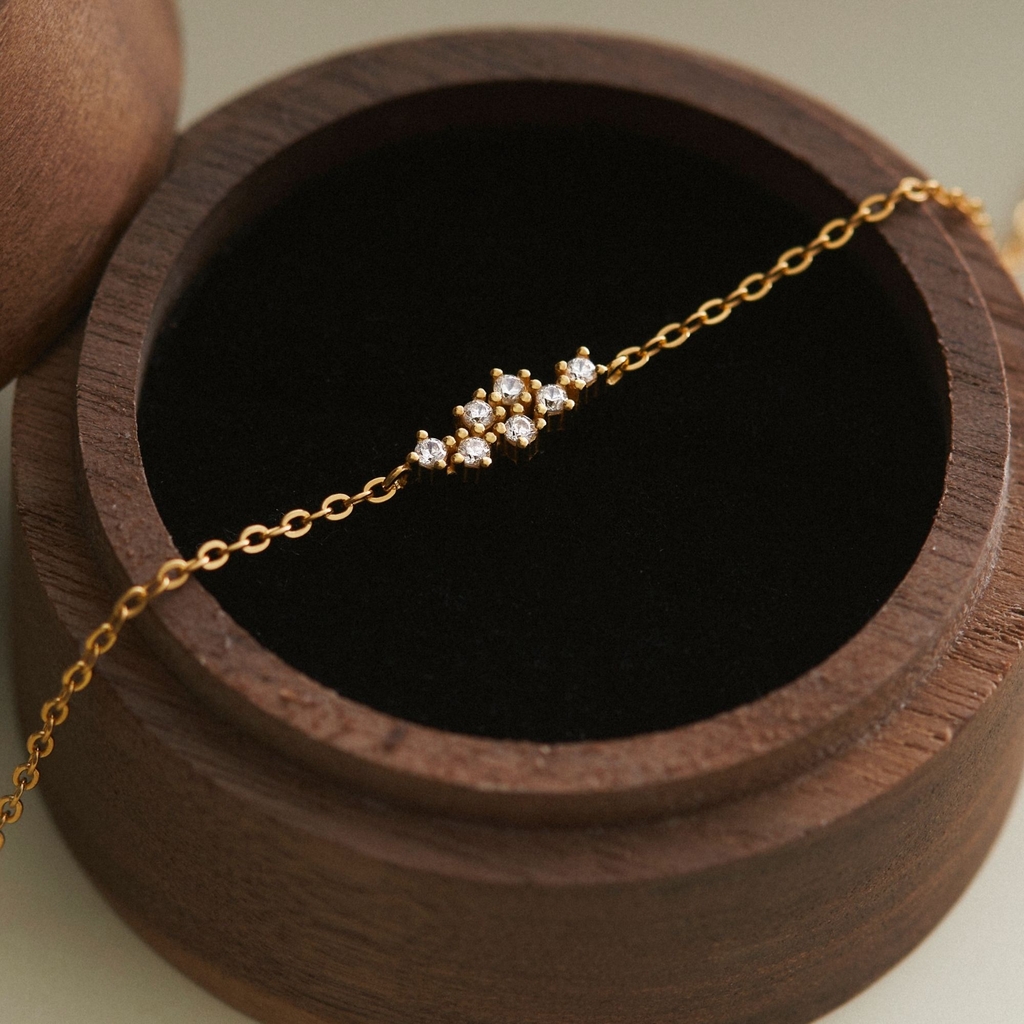 Lắc tay bạc 925 với dây xích mảnh thanh thoát, điểm xuyết chùm charm hình sao đính đá lấp lánh như dải ngân hà thu nhỏ. Các charm được bố trí hài hòa, tạo cảm giác nhẹ nhàng và tinh tế. |