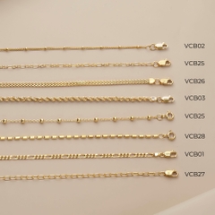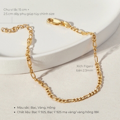Thiết kế thanh mảnh với xích Figaro trơn bóng, kết hợp các liên kết dài ngắn xen kẽ, tạo vẻ thanh lịch và chắc chắn. Kiểu dáng nhẹ nhàng, hiện đại, đi kèm khóa điều chỉnh linh hoạt, mang lại sự thoải mái khi đeo. |