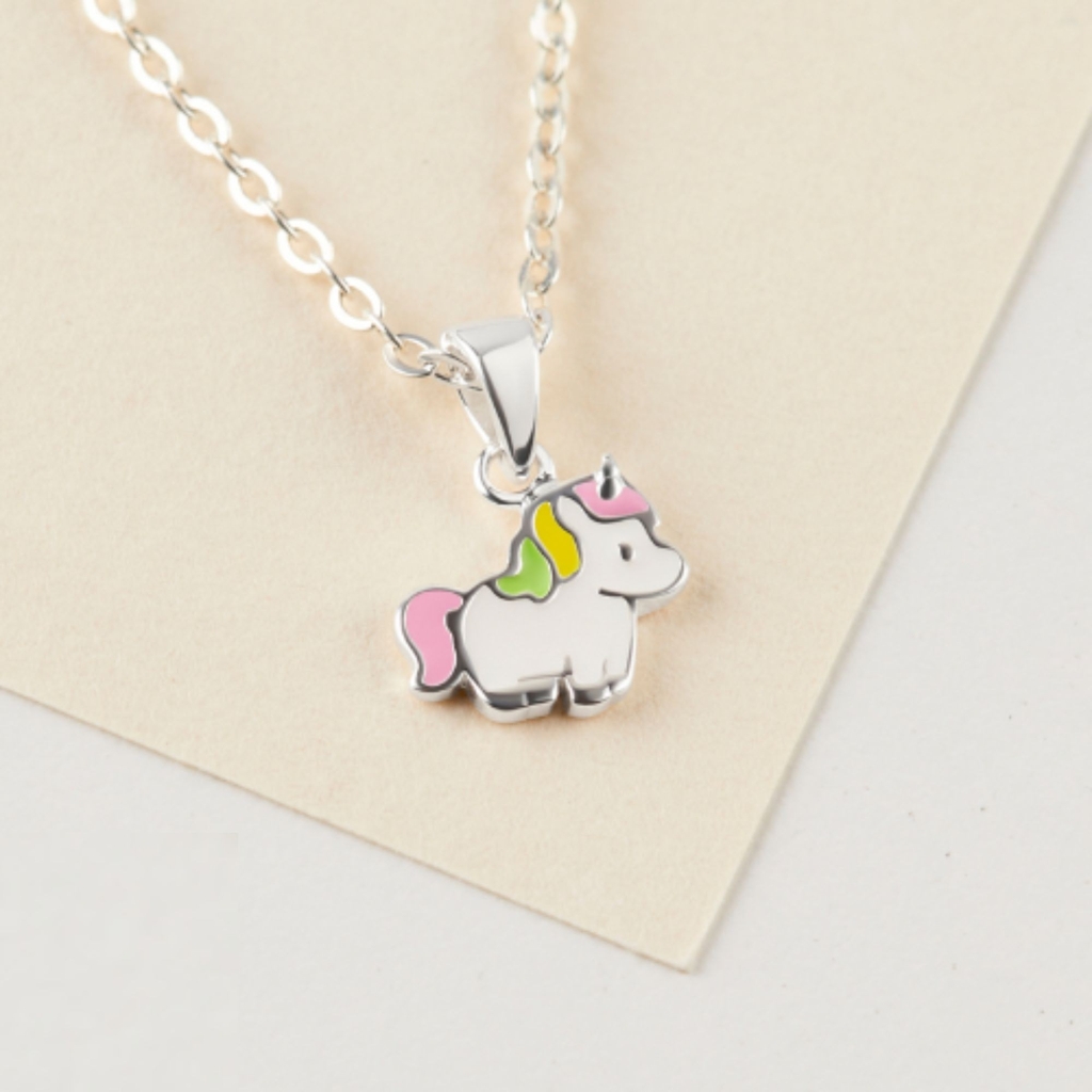 Đầu ngựa được khắc họa tỉ mỉ với đôi mắt tròn to ngây thơ, bờm uốn lượn nhẹ nhàng, mang đến vẻ đáng yêu và vừa vặn với cổ của bé. Dây chuyền mảnh mai đi kèm khóa cài tiện lợi, dễ dàng đeo hàng ngày hoặc kết hợp nhiều dây chuyền khác để tạo phong cách riêng. Thiết kế mang cảm hứng hoạt hình Hàn Quốc, phù hợp làm quà tặng sinh nhật hoặc những dịp đặc biệt, là món trang sức ý nghĩa giúp bé gái từ 3 đến 10 tuổi cảm thấy vui vẻ, tự tin và thêm phần nữ tính, dễ thương trong mọi hoạt động.