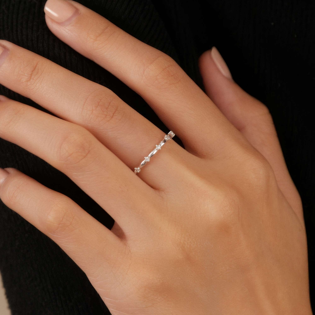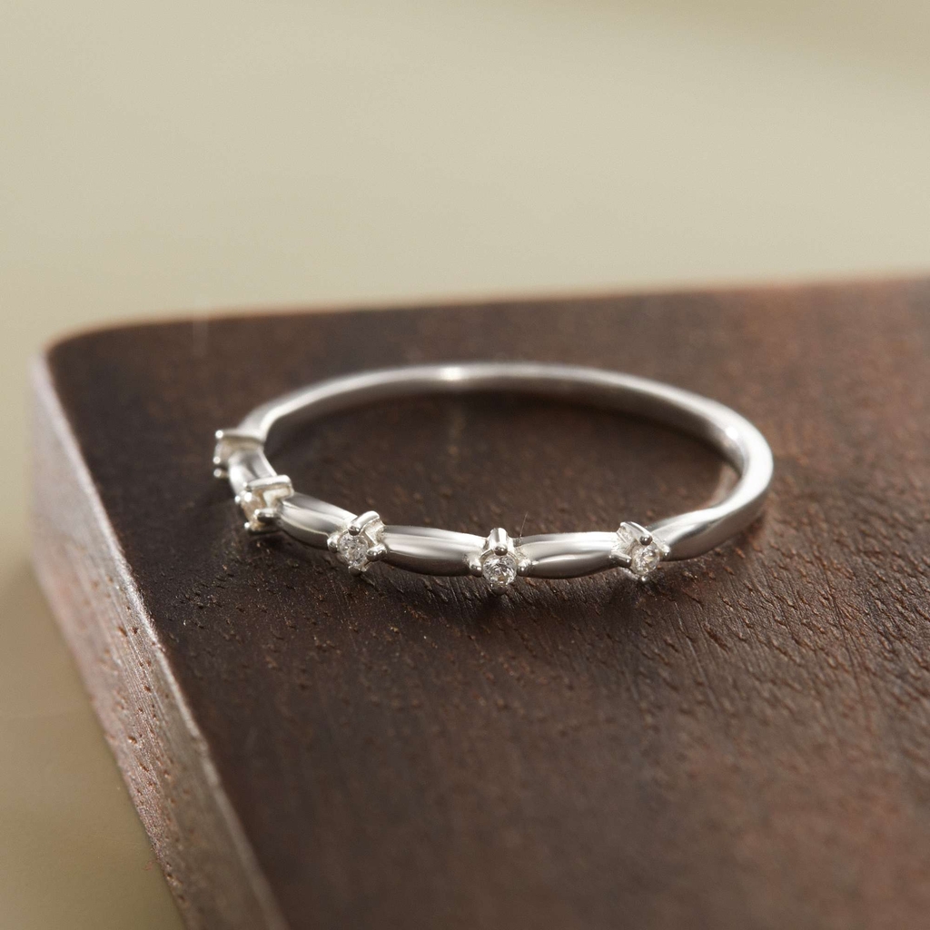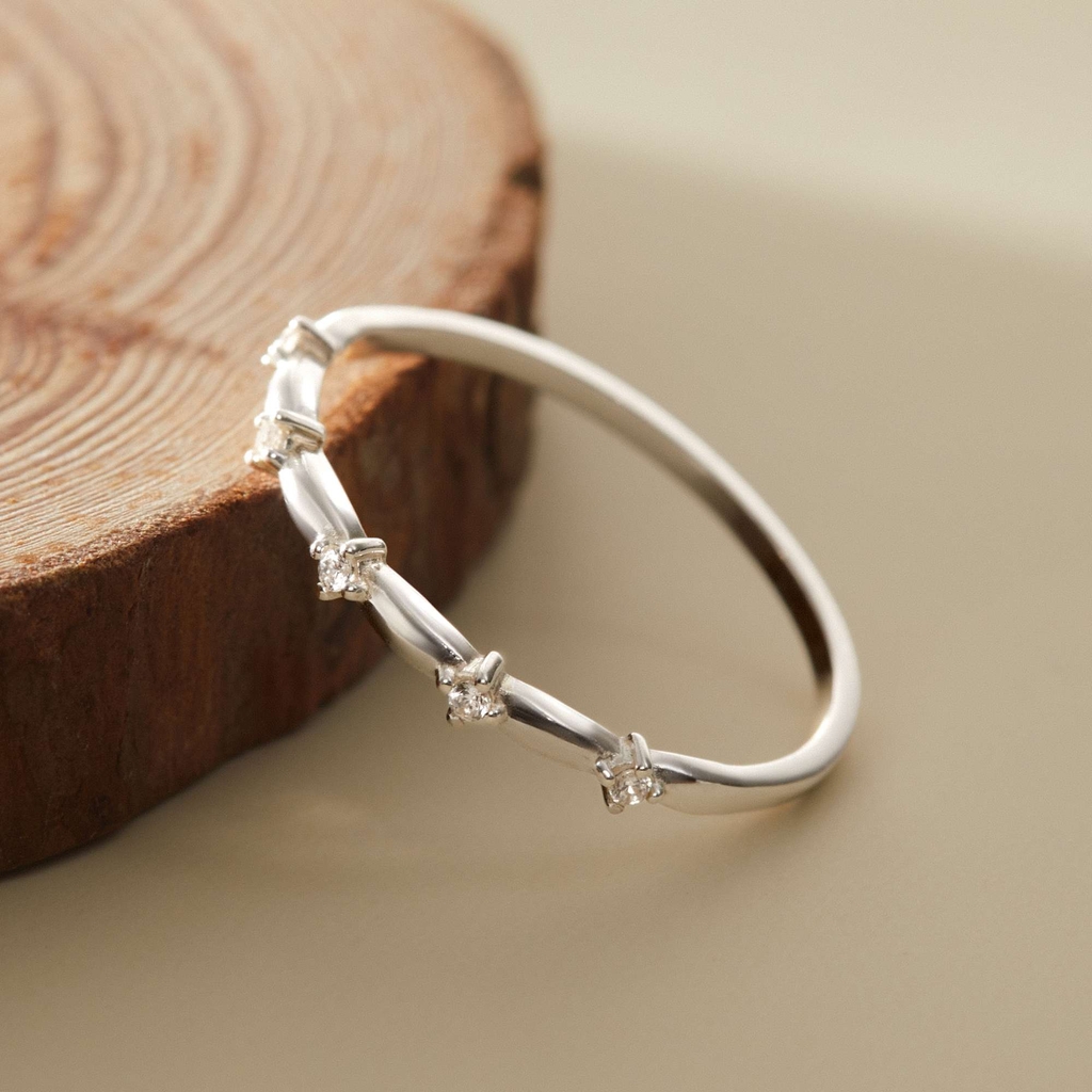 Nhẫn bạc 925 được thiết kế mảnh tinh tế, điểm xuyết các viên đá nhỏ xen kẽ dọc thân nhẫn tạo nhịp điệu nhẹ nhàng và sáng trong. Bề mặt uốn nhẹ giúp tổng thể thanh thoát, dễ phối cùng các nhẫn bản mảnh khác để tạo layer tinh tế. |