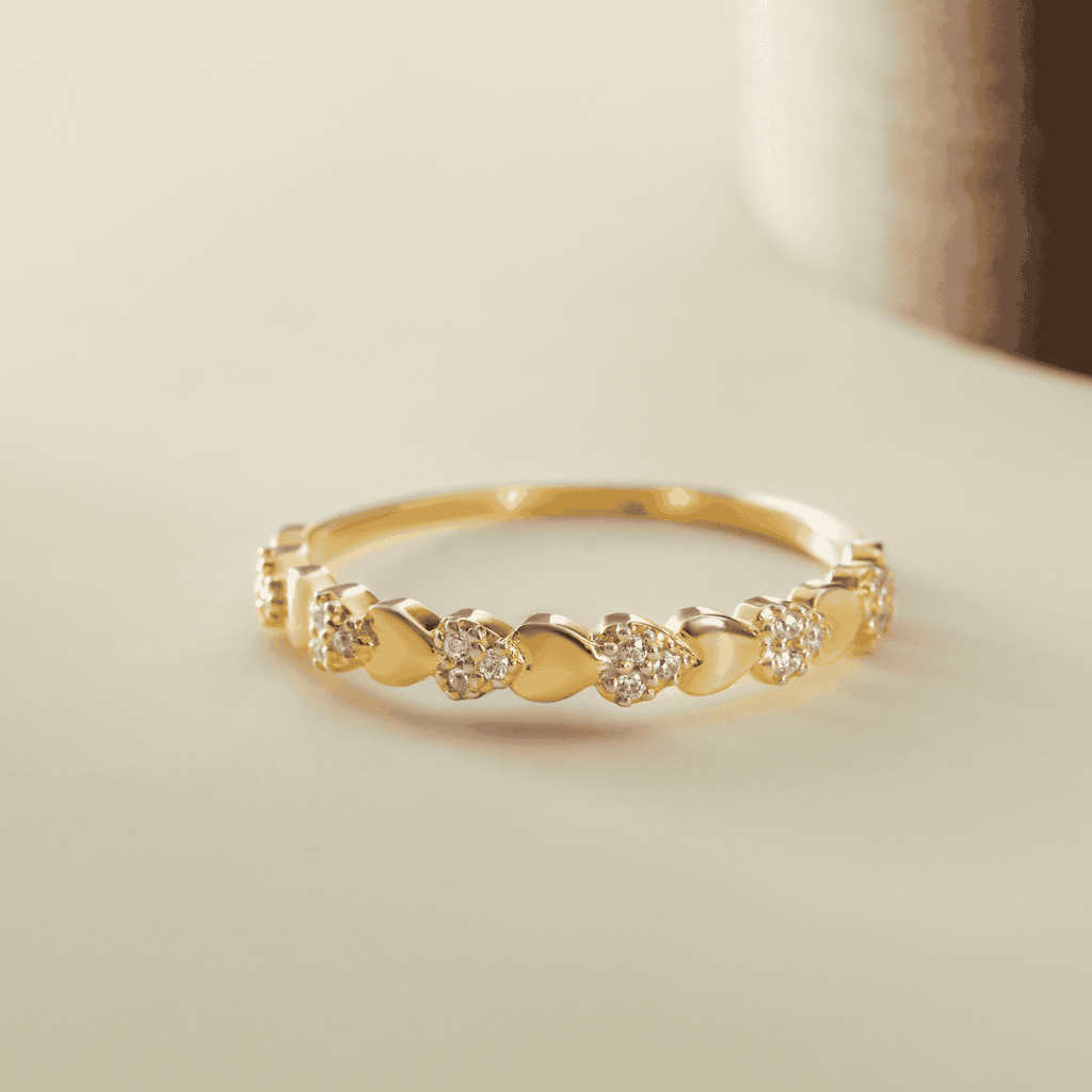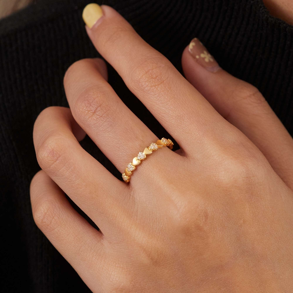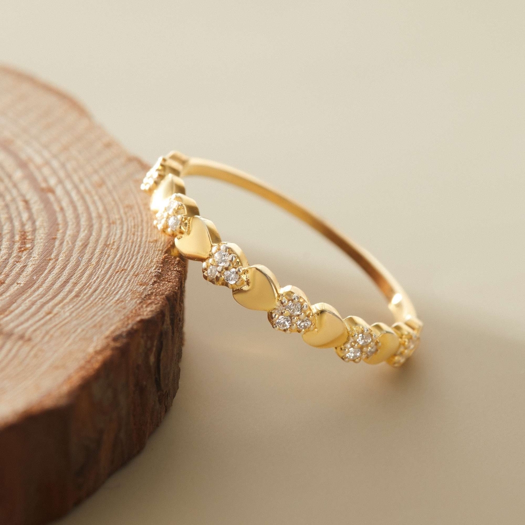 Nhẫn bạc 925 được thiết kế từ những mắt trái tim nhỏ ghép liền nhau, xen kẽ các cụm đá lấp lánh chạy dọc nửa vòng nhẫn. Form mảnh tinh tế nhưng vẫn nổi bật nhờ ánh phản chiếu mềm mại của bề mặt mạ vàng. |