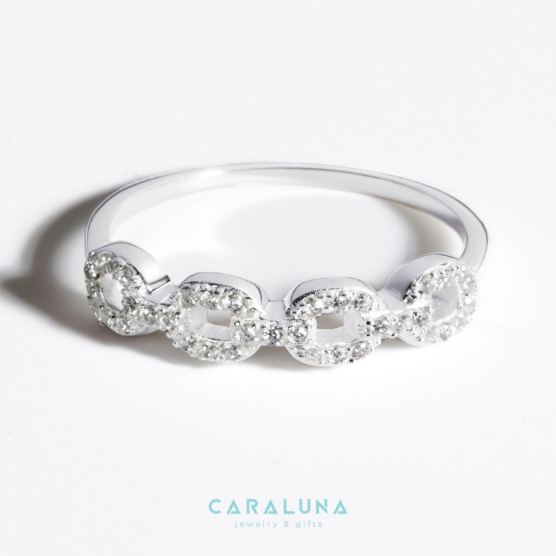 - Kiểu dáng: Dáng nhẫn chuỗi - chain ring; thiết kế mặt 4 vòng nối liền đính 39 viên đá CZ trắng; kỹ thuật đính đá Pave