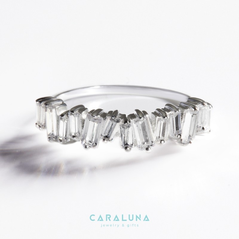 Nhẫn Bạc 925 đính 7 viên đá baguette chữ nhật xếp so le tinh tế tạo hiệu ứng ánh sáng đan xen rực rỡ. Nhẫn mảnh ôm vừa vặn ngón tay, nhẹ nhàng nhưng vẫn nổi bật |