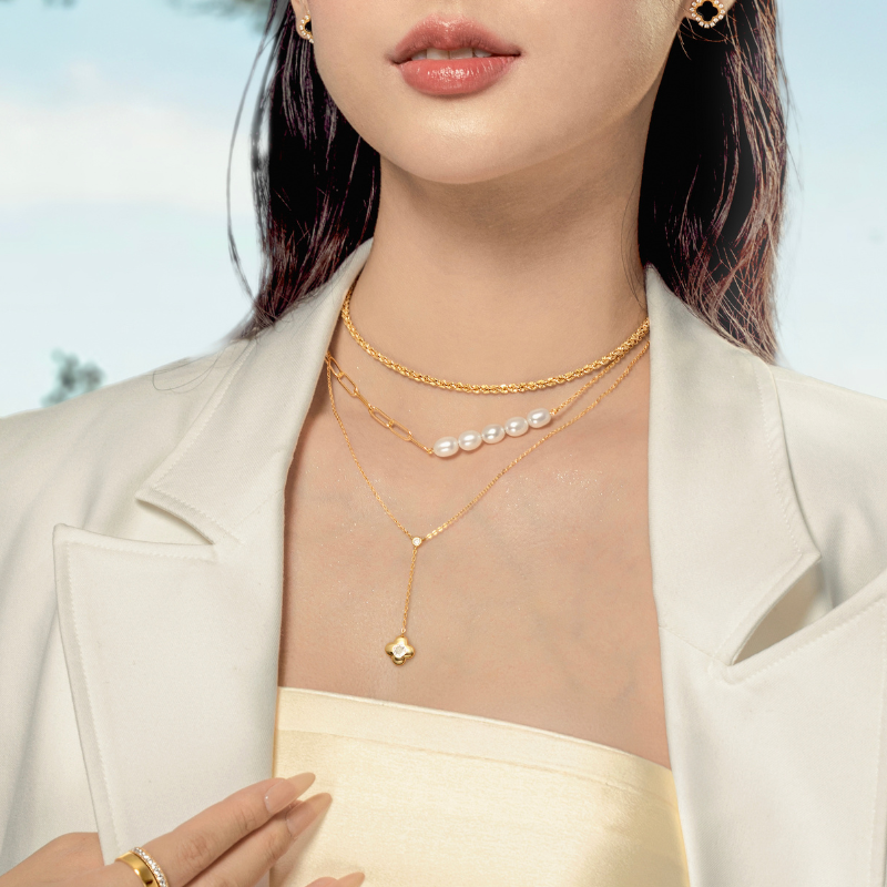 Thiết kế thanh thoát, mặt cỏ 4 lá đính đá lấp lánh thả trên dây phụ nhẹ nhàng. Được chế tác từ bạc 925, tùy chọn mạ vàng hoặc hồng, dây chuyền mảnh mai tạo sự tinh tế. Kiểu dáng cách điệu, hiện đại, ôm sát cổ, mang phong cách lãng mạn, duyên dáng. |