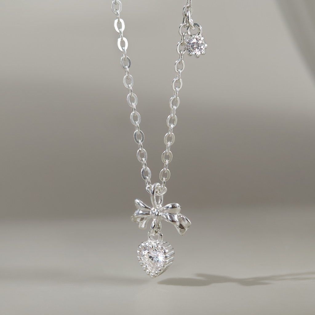 Dây chuyền bạc 925 hình nơ treo trái tim đính đá lấp lánh, làm từ bạc Ý cao cấp và có thể mạ vàng 18K hoặc bạc tùy chọn. Thiết kế nơ nhỏ xinh kết hợp trái tim tinh tế, biểu tượng cho tình yêu dịu dàng và nữ tính. Sợi dây mảnh nhẹ, dễ đeo hằng ngày, phù hợp với mọi cô gái. Dễ phối cùng khuyên tai đơn giản hoặc vòng tay mảnh để tạo vẻ ngọt ngào, thanh lịch trong buổi hẹn hò, tiệc tối hay khi đi làm.