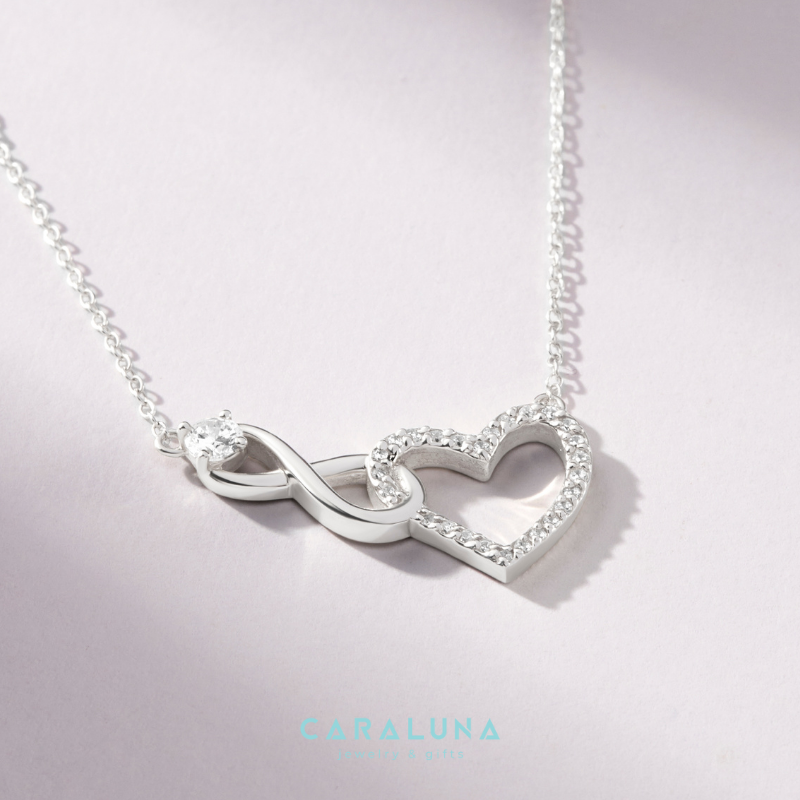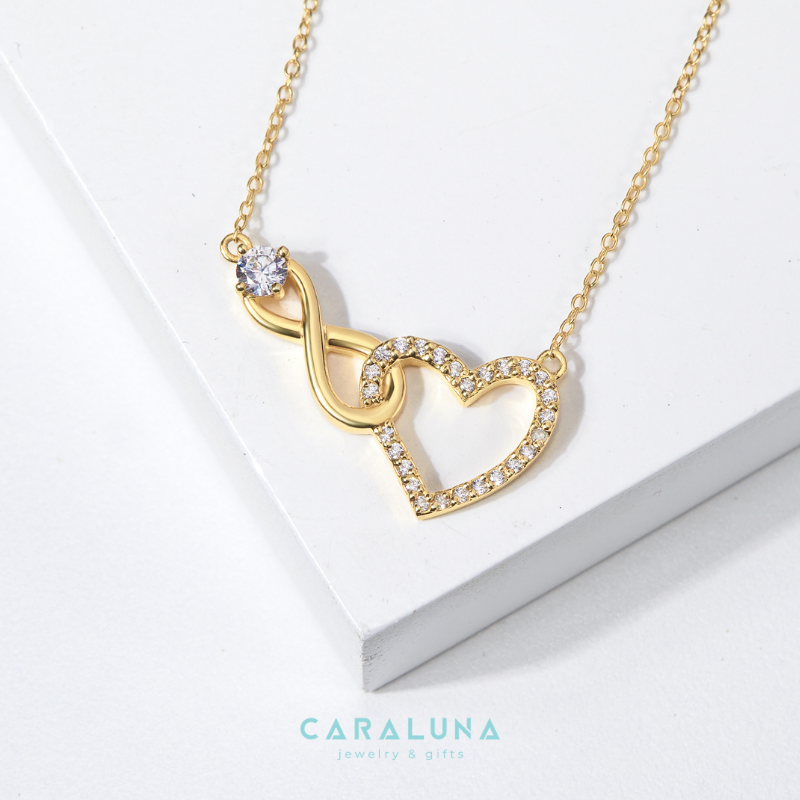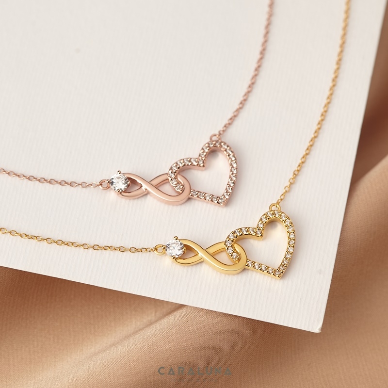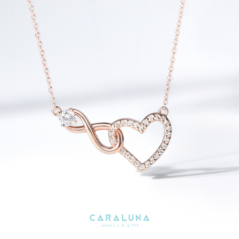 Dây Chuyền Bạc 925 Trái Tim Vô Cực Đính Đá Tình Yêu Vĩnh Cửu - Infinite Love của CaraLuna sở hữu thiết kế thanh lịch với biểu tượng vô cực uốn lượn tinh tế, kết hợp trái tim đính đá CZ trắng lấp lánh tạo hiệu ứng ánh sáng lung linh. Chất liệu bạc Ý 925 mạ vàng hồng 18K ấm áp, dây xích mảnh mai, phù hợp đeo hàng ngày.