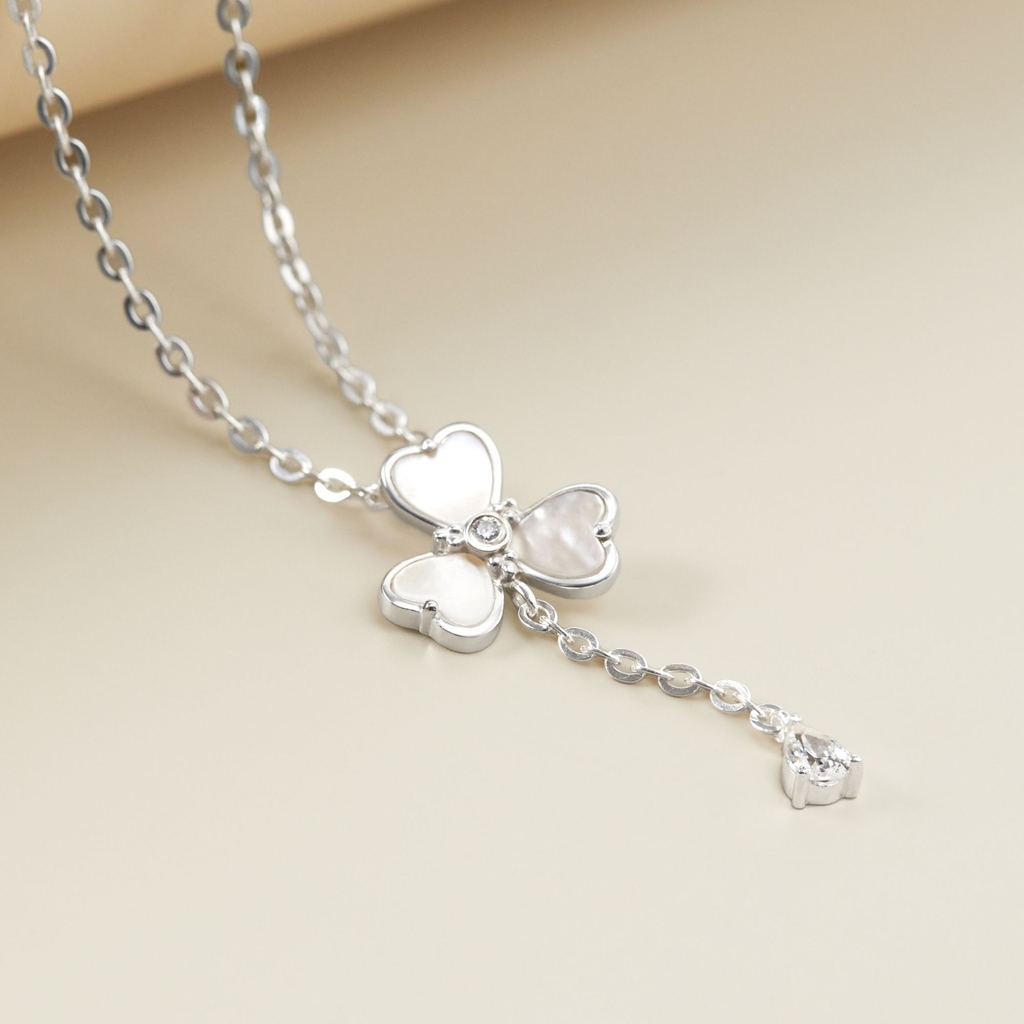 Dây Chuyền Lariat Bạc 925 Cỏ 4 Lá Trái Tim Trai Xà Cừ Đính Đá Giọt Nước – VYN75 của Cara Luna được chế tác từ bạc Ý 925 chuẩn định lượng, kết hợp hài hòa giữa trai xà cừ óng ánh và đá CZ giọt nước lấp lánh. Thiết kế lariat mềm mại, thanh thoát, nổi bật với charm cỏ 4 lá dáng trái tim tượng trưng cho may mắn, hạnh phúc và tình yêu bền vững.