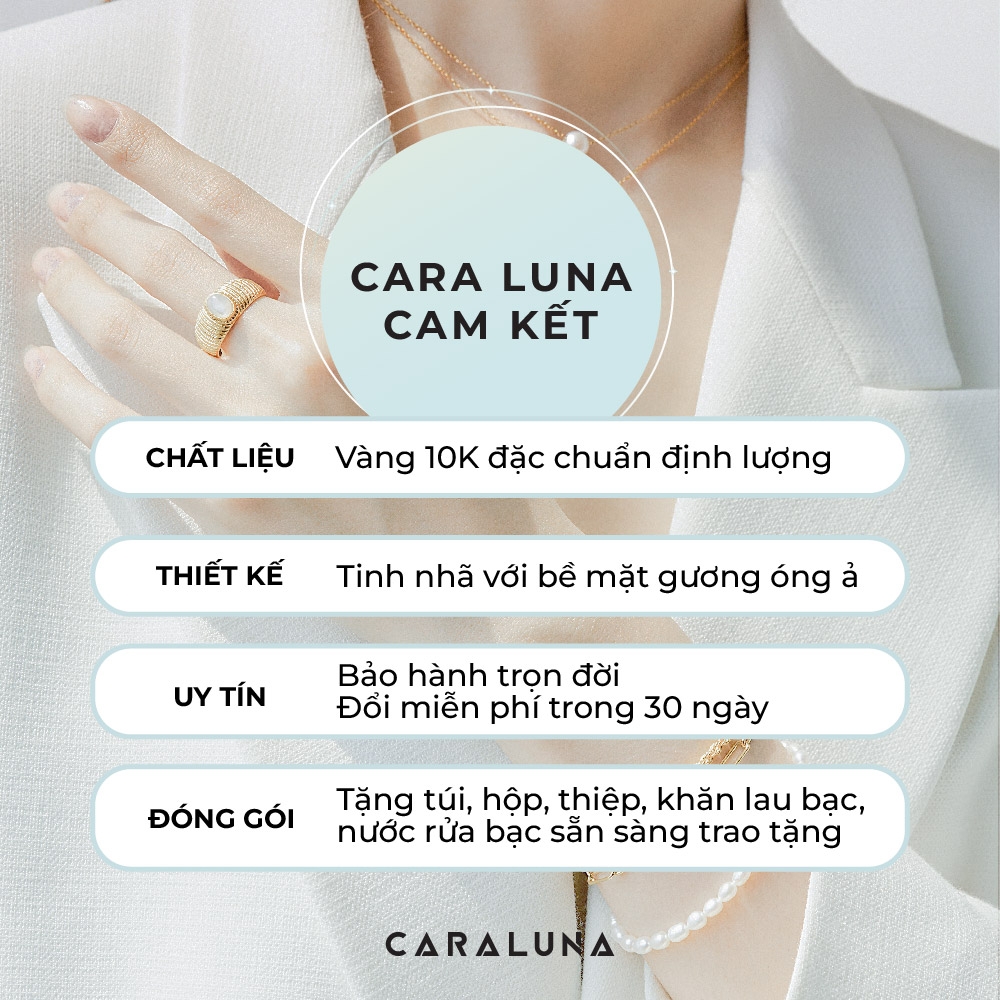 | Cách bảo quản & chăm sóc | Hạn chế tiếp xúc hóa chất, tránh đeo khi đi tắm, nên vệ sinh sản phẩm bằng khăn lau chuyên dụng Cara Luna và sau khi sử dụng vui lòng bảo quản trong hộp kín để tránh tiếp xúc với không khí và tránh bị oxi hóa |