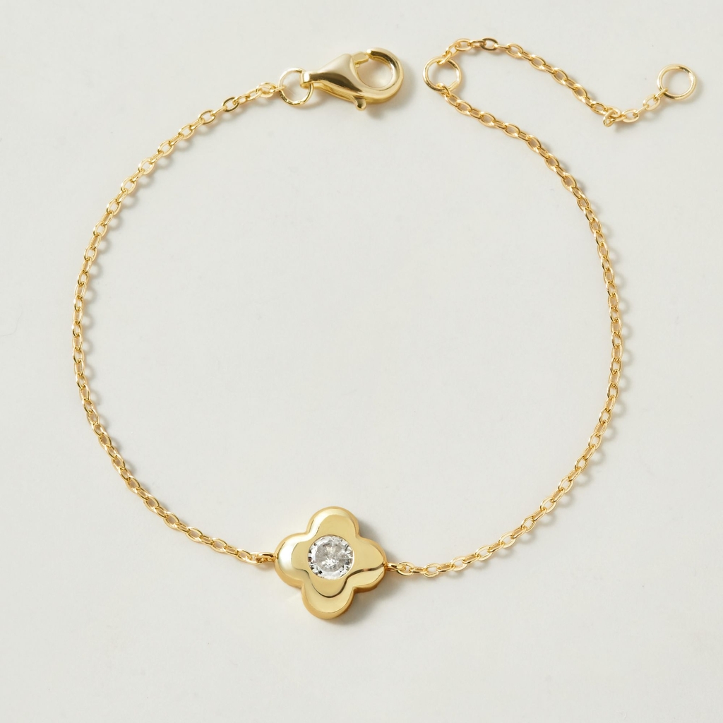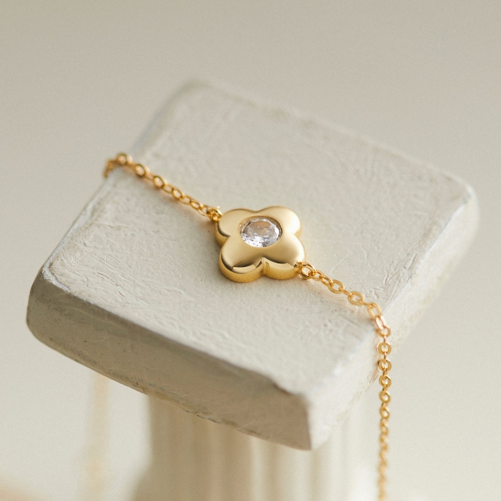 Thiết kế dây bạc 925 mảnh mai, nhẹ nhàng ôm cổ tay. Tâm điểm là charm hình cỏ bốn lá được chạm khắc tỉ mỉ, biểu tượng của sự may mắn và bình an. Giữa charm là viên đá nhỏ lấp lánh, tạo điểm sáng nổi bật, khiến tổng thể càng thêm cuốn hút. Thiết kế đơn giản, hiện đại, phù hợp cho phái nữ |
