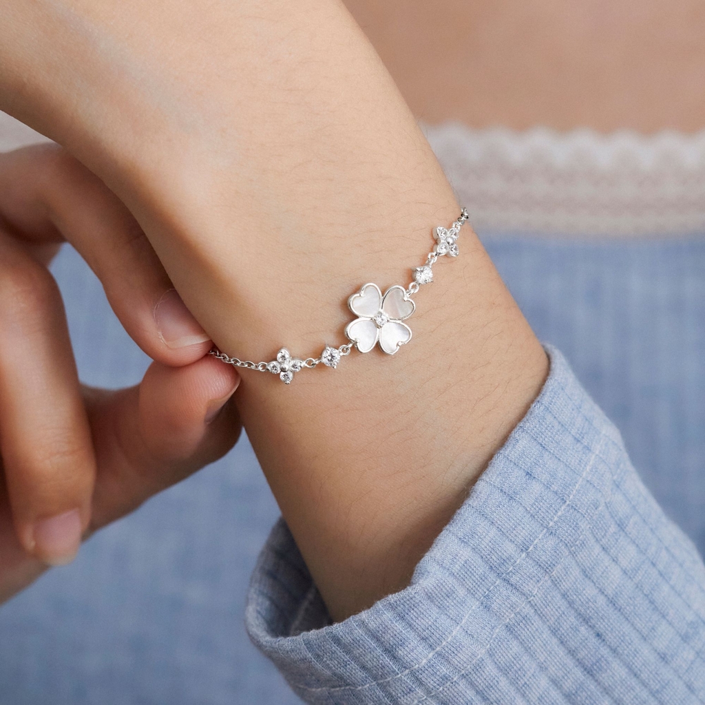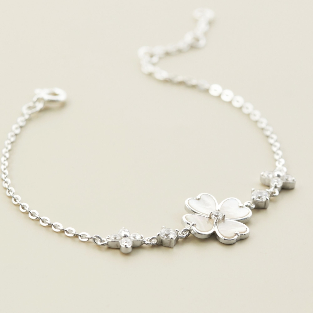 Thiết kế tinh xảo với chuỗi bạc mảnh mai được điểm xuyết hoa cỏ bốn lá cách điệu hình trái tim. Mỗi cánh hoa được phủ lớp trai xà cừ óng ánh, xen kẽ đá cz lấp lánh, tạo nên hiệu ứng sáng nhẹ nhàng và sang trọng. |