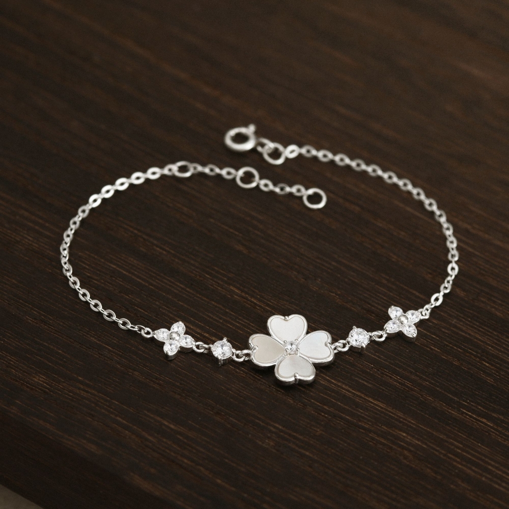 Lắc Tay Bạc 925 Cỏ 4 Lá Trái Tim Trai Xà Cừ sở hữu vẻ đẹp nữ tính, thanh lịch với thiết kế tinh xảo từ bạc Ý 925 chuẩn định lượng, kết hợp trai xà cừ óng ánh cùng đá CZ lấp lánh tạo điểm nhấn nhẹ nhàng nhưng cuốn hút. Hình ảnh cỏ 4 lá cách điệu dáng trái tim mang thông điệp về may mắn – tình yêu – tài lộc, như một lời chúc ngọt ngào gửi đến người đeo.