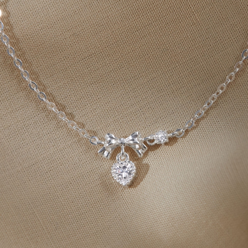Thiết kế nơ nhỏ treo trái tim từ bạc 925 mạ vàng, đính đá lấp lánh, dây mảnh nhẹ nhàng. Kiểu dáng thanh thoát, tinh tế, tạo vẻ ngọt ngào, duyên dáng. Phong cách lãng mạn Hàn Quốc, phù hợp sự nữ tính, thanh lịch. |