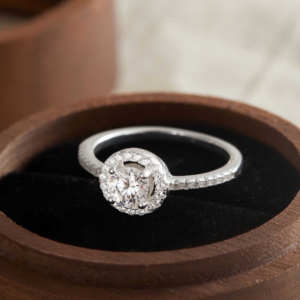 Nhẫn được chế tác tinh xảo từ bạc 925 cao cấp, mang phong cách cổ điển và thanh lịch với thiết kế halo sang trọng. Viên đá chủ cắt tròn mô phỏng kim cương moissanite lấp lánh, bao quanh là những viên đá nhỏ tạo hiệu ứng ánh sáng rực rỡ. Thân nhẫn mảnh, đính đá dọc hai bên, tôn lên vẻ tinh tế và cuốn hút cho đôi tay. |