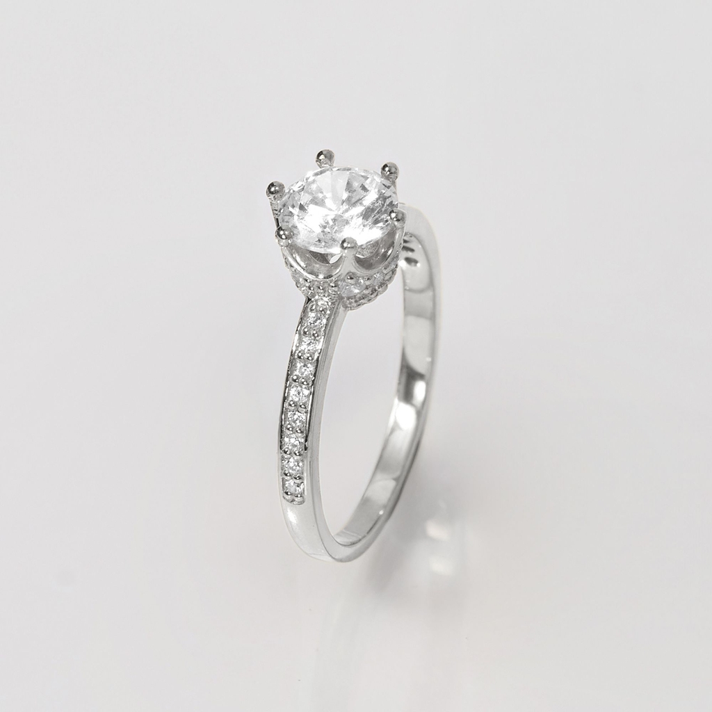 Nhẫn được chế tác tinh xảo từ bạc 925 cao cấp, lấy cảm hứng từ chiếc vương miện lấp lánh (biểu tượng của sự kiêu hãnh và vẻ đẹp quyền quý). Viên đá Moissanite tròn ở trung tâm tỏa sáng rực rỡ như kim cương thật, được đỡ chắc chắn trên khung vương miện uốn lượn, xung quanh là những viên đá nhỏ lấp lánh tạo hiệu ứng sáng đa tầng. Thân nhẫn mảnh khảm đá hai bên, tôn lên nét thanh thoát và nữ tính. |