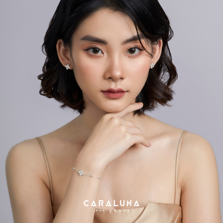 Không chỉ chứa đựng nhiều tâm tư đặc biệt, set trang sức còn được chế tác tỉ mỉ đính kèm 4 viên đá CZ trắng sáng, tinh xảo giúp gương mặt nàng bừng sáng, thanh thoát và tao nhã.