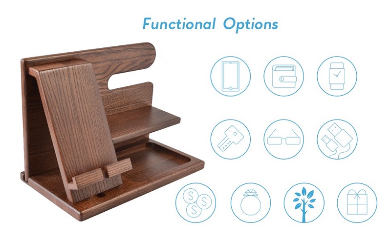 Một giá đỡ điện thoại đa năng không chỉ giúp sạc điện thoại mà còn bảo quản các phụ kiện khác như đồng hồ, mắt kính, ví tiền, nữ trang,… Sản phẩm có kích thước 15 x 25 x 18cm và được thiết kế thông minh, dễ lắp ráp. Hướng dẫn lắp ráp kèm vít và dụng cụ lắp giúp việc lắp đặt trở nên dễ dàng hơn bao giờ hết. Bề mặt được chà nhám mịn màng và sơn PU an toàn cho sức khỏe. Đây là một lựa chọn quà tặng người yêu tuyệt vời và chắc chắn sẽ gây ngạc nhiên cho bạn gái khi được trình bày trong hộp quà xinh xắn.