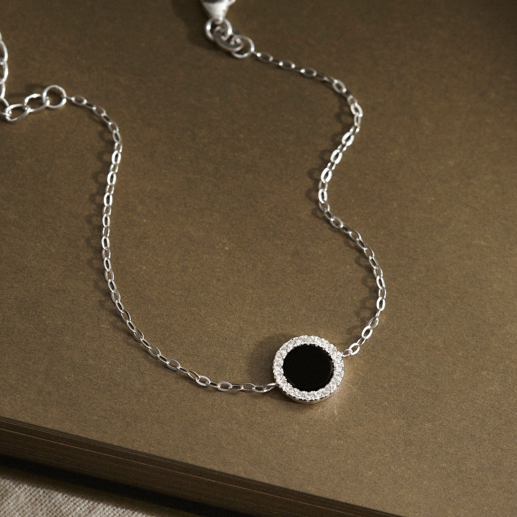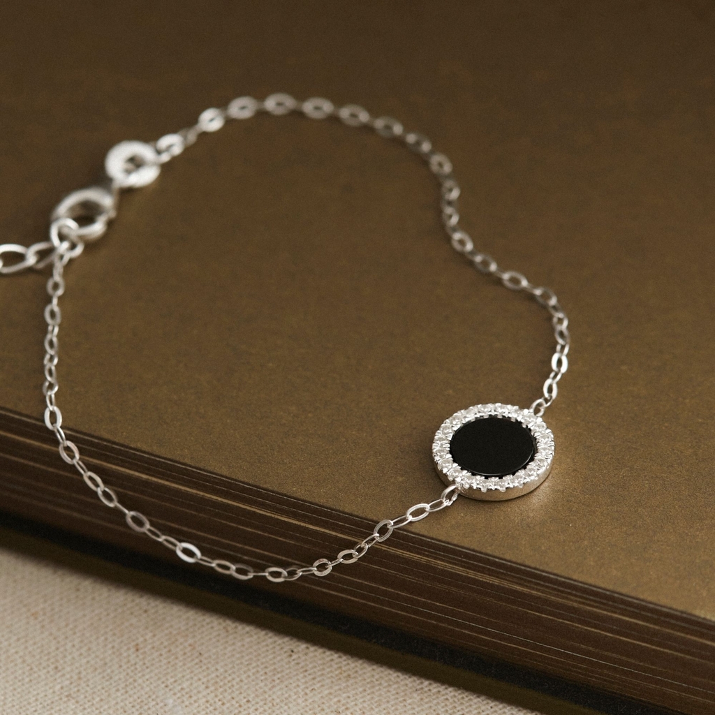 Dạng vòng tay gắn mặt charm hình tròn đính đá chủ Onyx đen và 20 viên đá CZ trắng viền xung quanh |