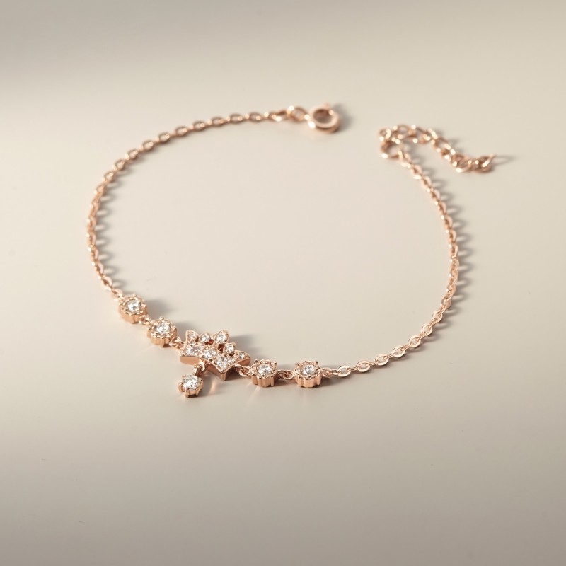 Vòng tay Crown Princess được làm từ bạc Ý cao cấp, phủ lớp vàng hồng ấm áp, mang lại cảm giác sang trọng và tinh tế. Điểm nhấn là charm vương miện công chúa lấp lánh ở giữa, hai bên điểm xuyết đá trắng và charm hình tim nhỏ xinh. |